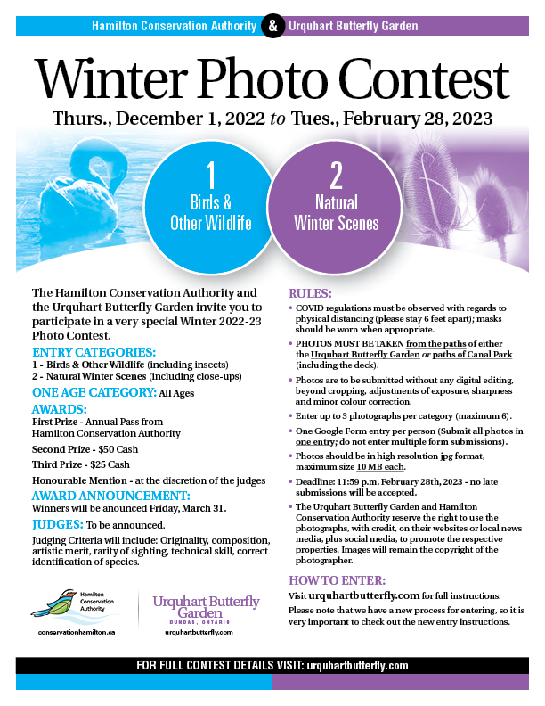 It is already December which means once again the Urquhart Butterfly Garden, in partnership with the Hamilton Conservation Authority, is holding a Winter Photo Contest. Please see the poster below for submission guidelines.