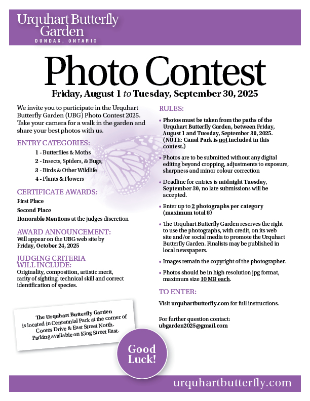 - The Urquhart Butterfly Garden and Hamilton Conservation Authority reserve the right to use the photographs, with credit, on their websites or local news media, including social media, to promote the