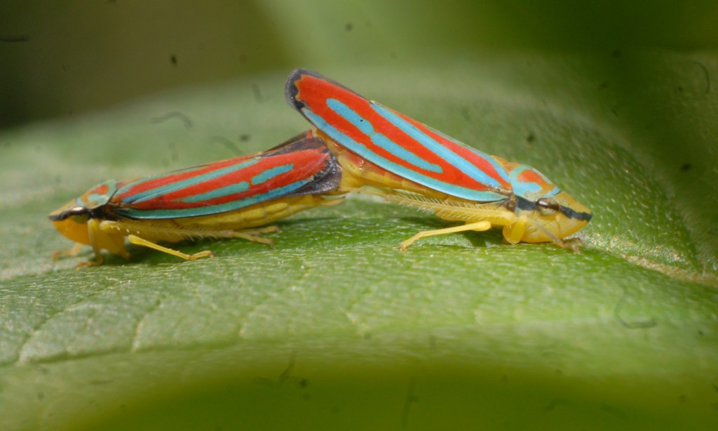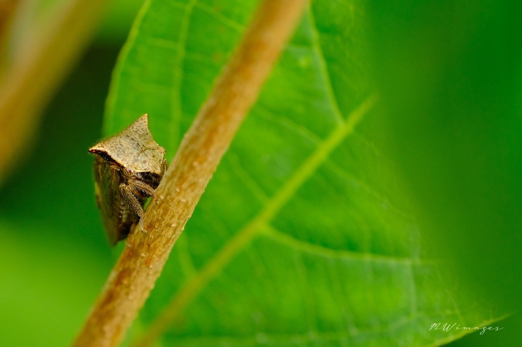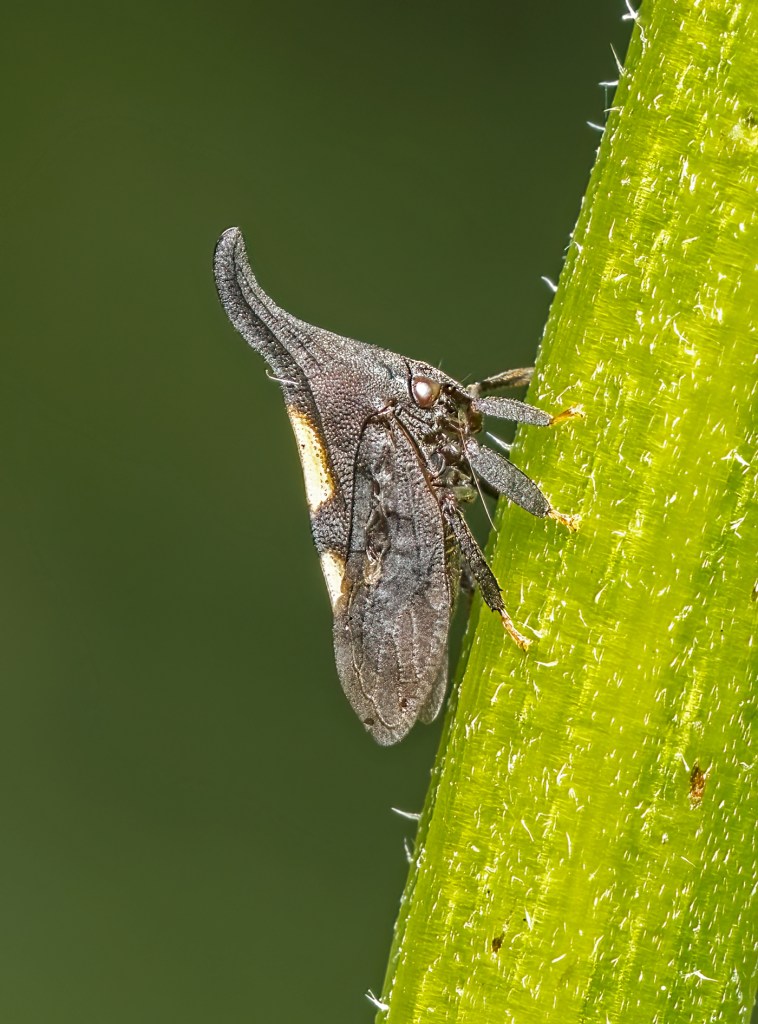 Two-marked Treehopper Enchenopa binotata …”two spots” is a species complex, a group of nine species that are identical in appearance (as adults) while remaining reproductively separate. This particular treehopper is a bit of a oddity in that if the male and female produce offspring from a non-host plant, fewer eggs are laid but the newly hatched offspring could become a new species based on the phenology of the new host plant …